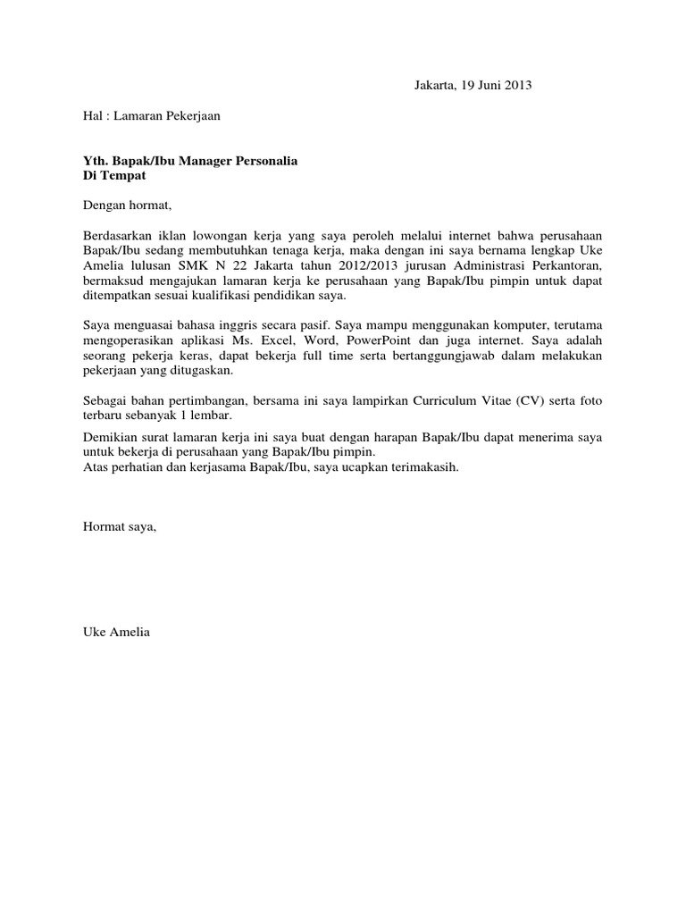 Apalagi bila anda sudah berkeluarga dan anda adalah seorang suami. Berikut contoh surat lamaran kerja fresh graduateuntuk sma dan smk saat ini saya adalah fresh graduate dari universitas indonesia jurusan ilmu administrasi negara. Smk purnama bakti, jurusan tata boga. Bagaimanapun juga apakah kamu layak diterima di sebuah perushaan apa tidak juga bergantung pada resume yang kamu kirimkan. Surat lamaran merupakan surat permohonan yang dibuat oleh para pelamar pekerjaan atau pencari kerja, kemudian dikirimkan terhadap suatu.