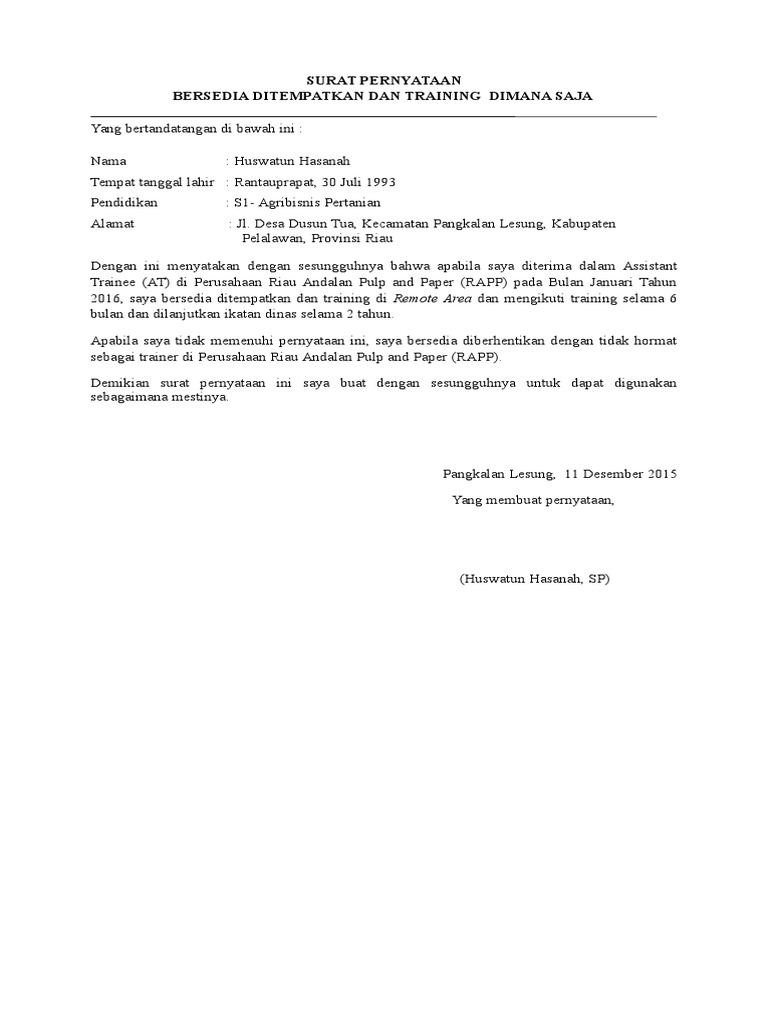 3.15 contoh surat pernyataan bersedia ditempatkan dimana saja. Demikian pernyataan ini saya buat dengan sesungguhnya, dan saya bersedia dituntut dimuka pengadilan serta bersedia menerima segala tindakan yang diambil oleh pemerintah. Dan untuk bukti hutang piutang tersebut, seringkali seorang peminjam harus. .tahun 2012, saya bersedia ditempatkan dan bekerja di mana saja di seluruh wilayah republik indonesia pada unit pelayanan teknis (upt) milik apabila saya tidak memenuhi pernyataan ini, saya bersedia diberhentikan dengan tidak hormat sebagai calon pegawai negeri sipil/pegawai. Documents similar to surat pernyataan bersedia ditempatkan dimana saja.
